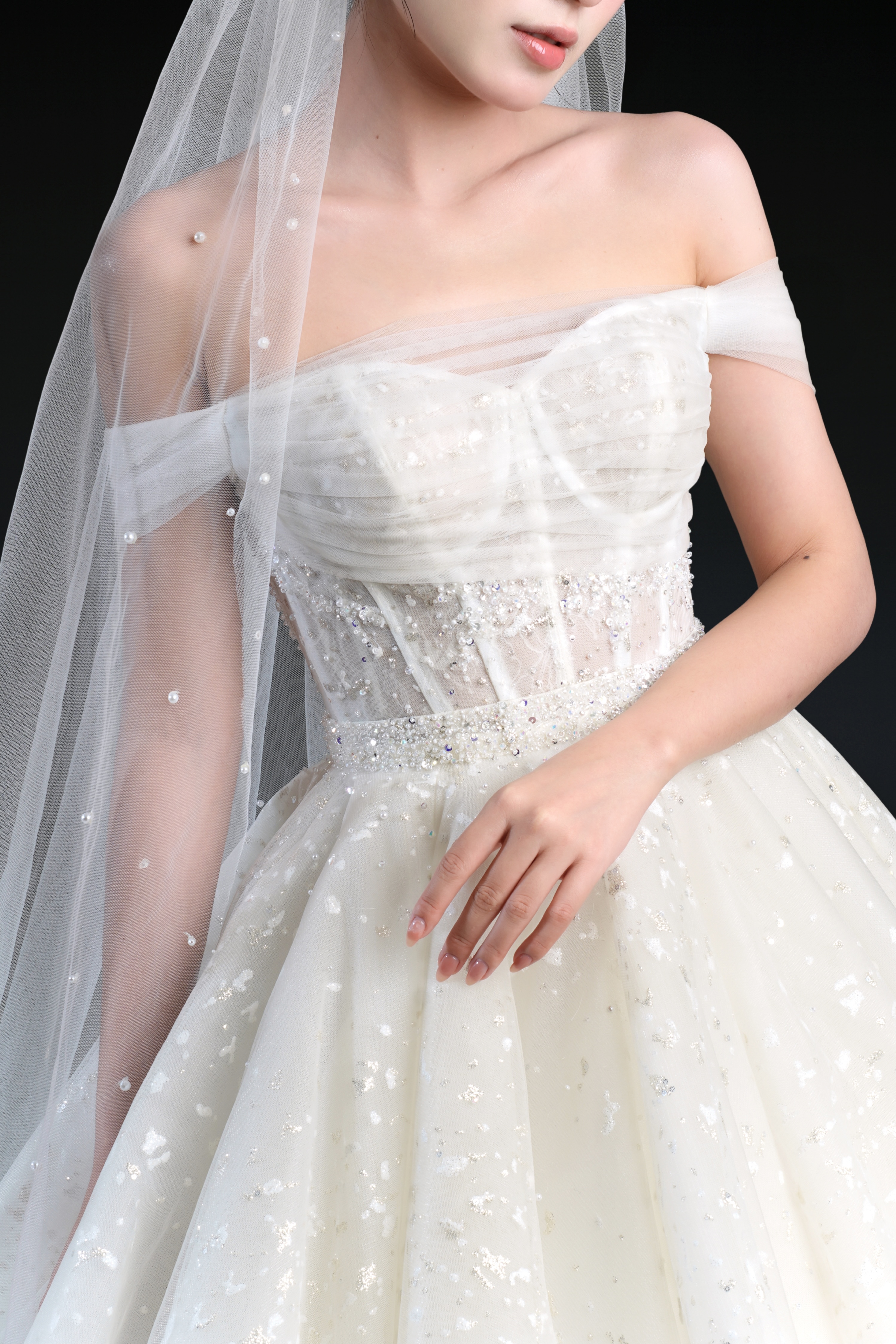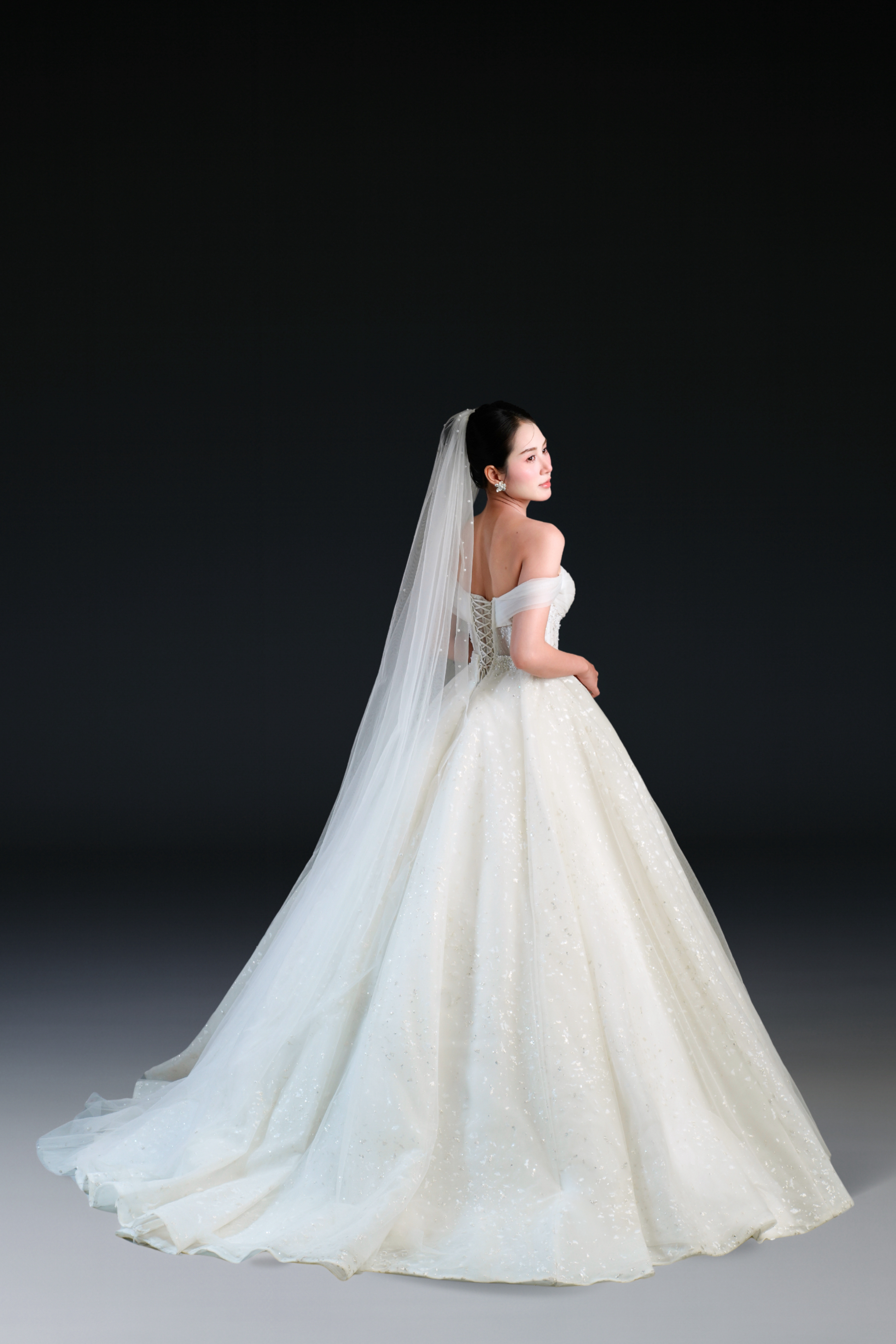 Bộ sưu tập gồm 24 thiết kế, từ form Ball Gown lộng lẫy với kỹ thuật dựng corset signature tôn dáng hoàn hảo, đến form A-line thanh thoát, xòe nhẹ. Mỗi thiết kế đều được xử lý trên nền ren cao cấp, nền vải nhũ dát sequins lấp lánh, cườm đá đính kết thủ công tạo nên hiệu ứng ánh sáng đầy mê hoặc.
