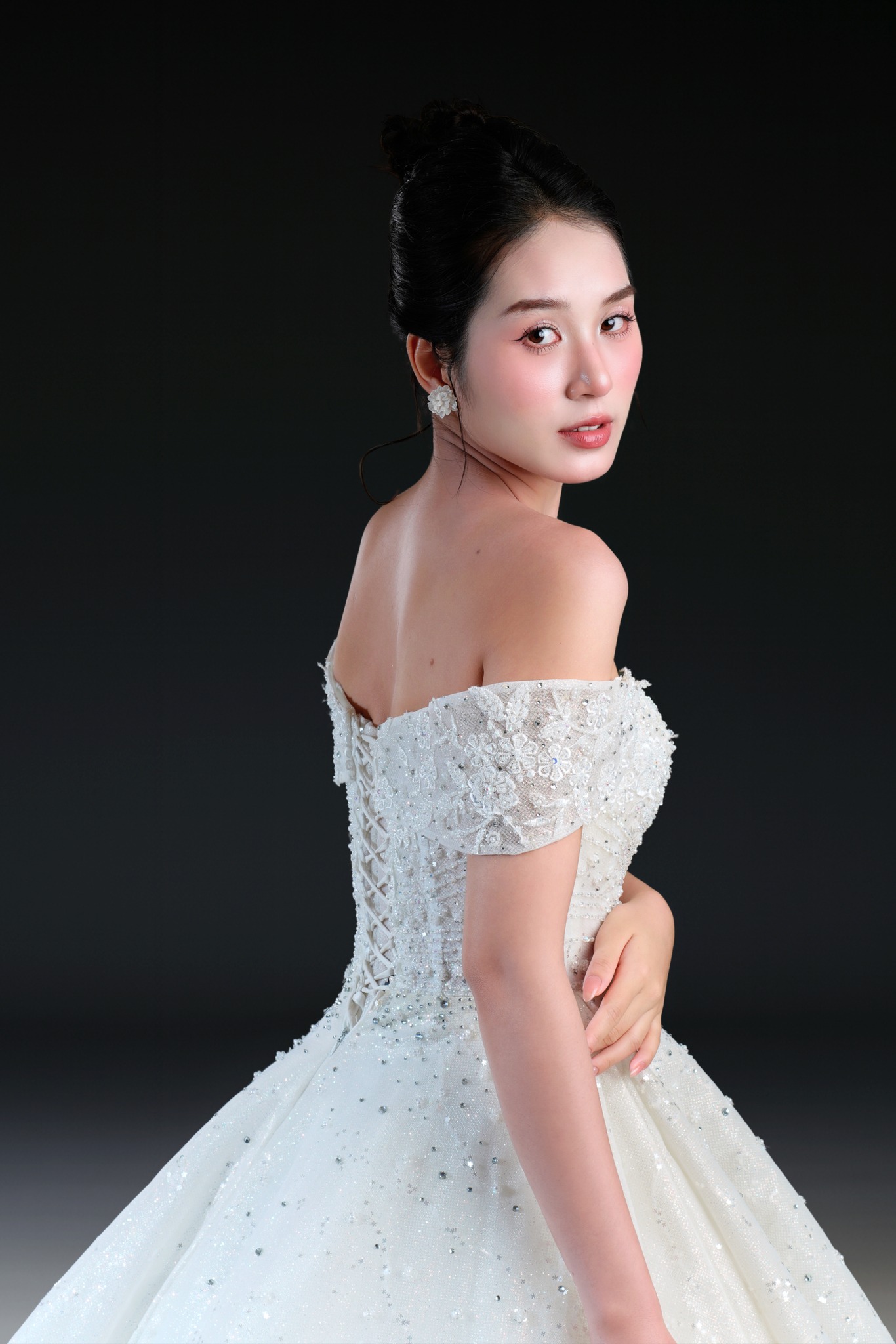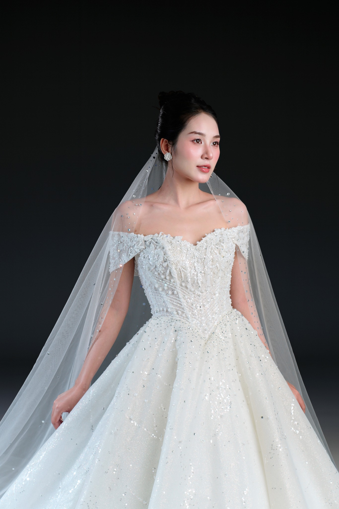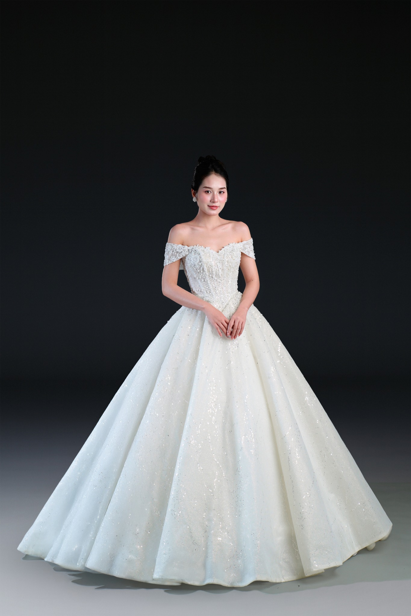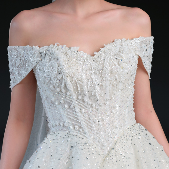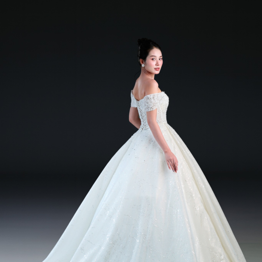 Bộ sưu tập gồm 24 thiết kế, từ form Ball Gown lộng lẫy với kỹ thuật dựng corset signature tôn dáng hoàn hảo, đến form A-line thanh thoát, xòe nhẹ. Mỗi thiết kế đều được xử lý trên nền ren cao cấp, nền vải nhũ dát sequins lấp lánh, cườm đá đính kết thủ công tạo nên hiệu ứng ánh sáng đầy mê hoặc.