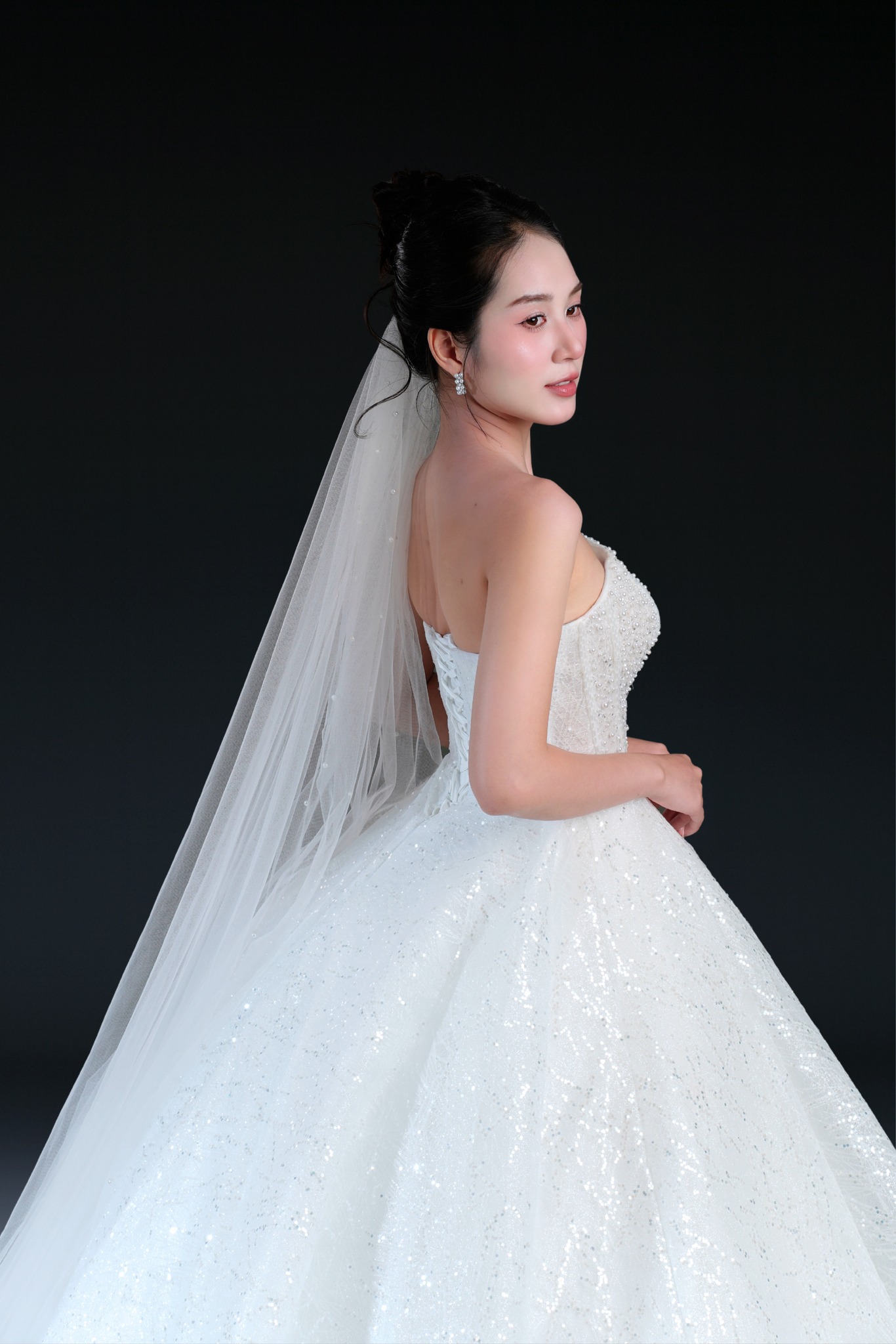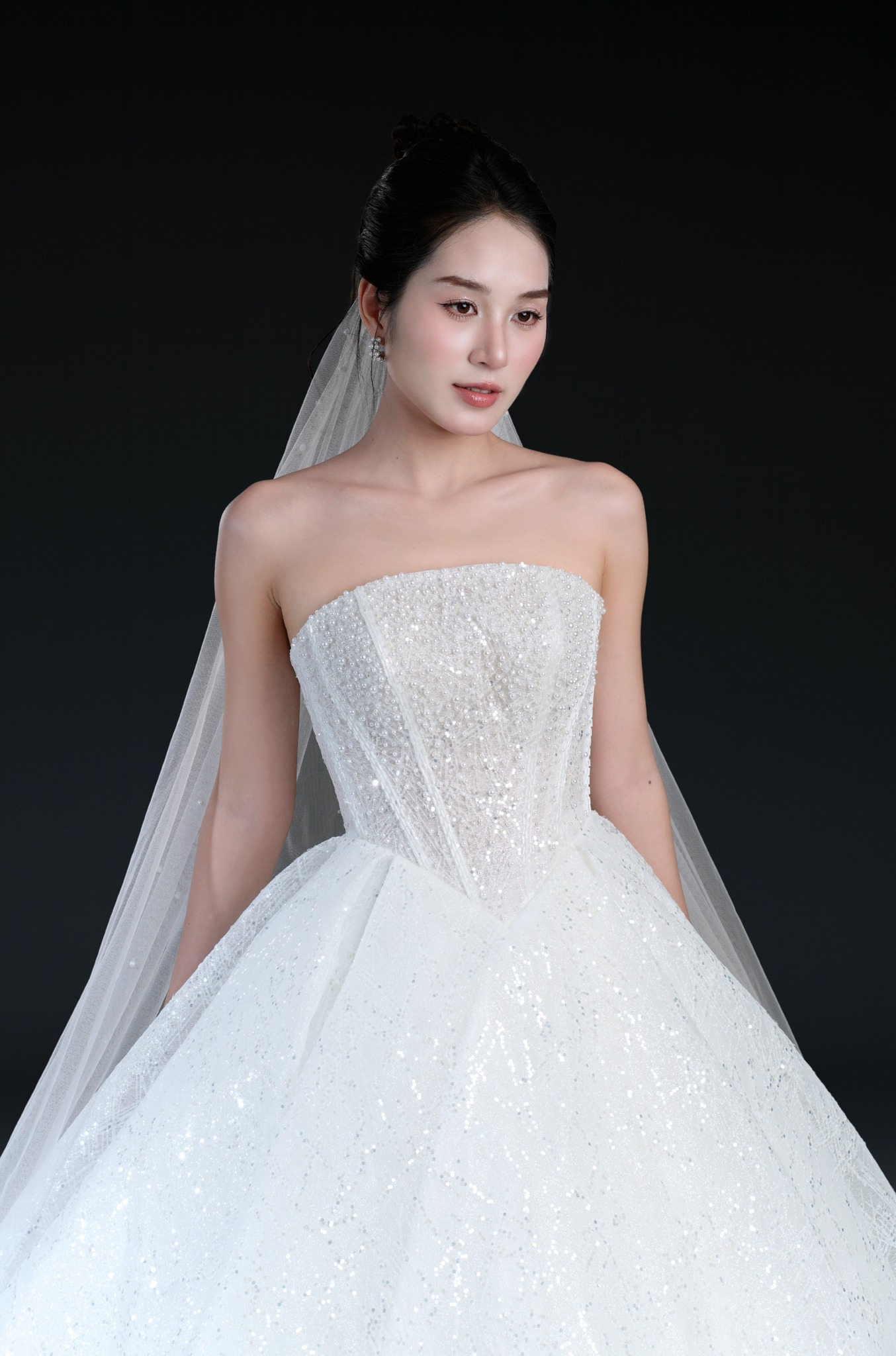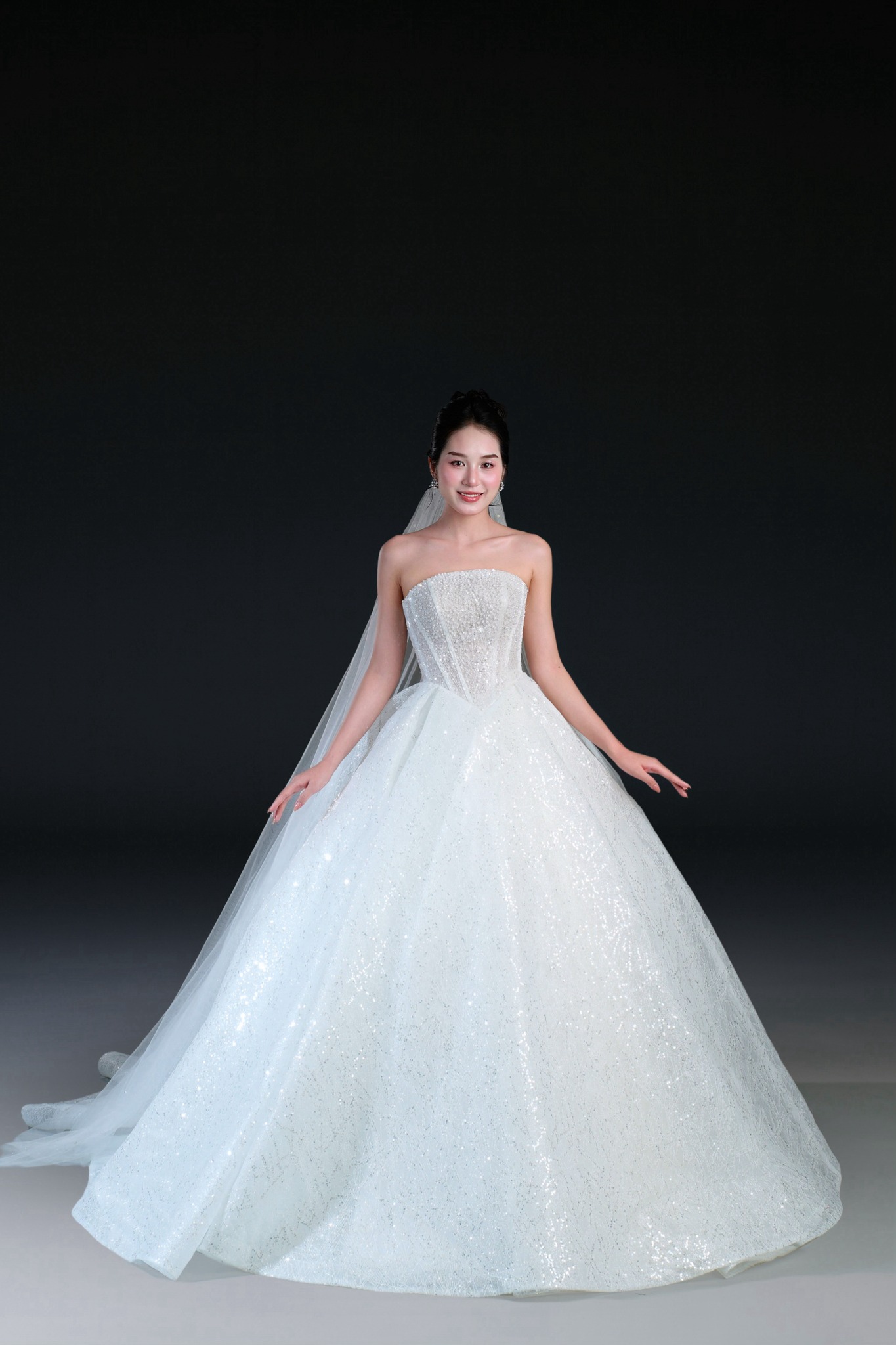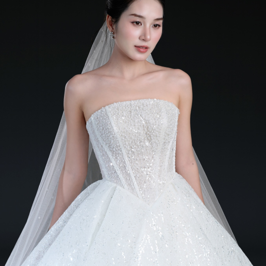 Bộ sưu tập gồm 24 thiết kế, từ form Ball Gown lộng lẫy với kỹ thuật dựng corset signature tôn dáng hoàn hảo, đến form A-line thanh thoát, xòe nhẹ. Mỗi thiết kế đều được xử lý trên nền ren cao cấp, nền vải nhũ dát sequins lấp lánh, cườm đá đính kết thủ công tạo nên hiệu ứng ánh sáng đầy mê hoặc.