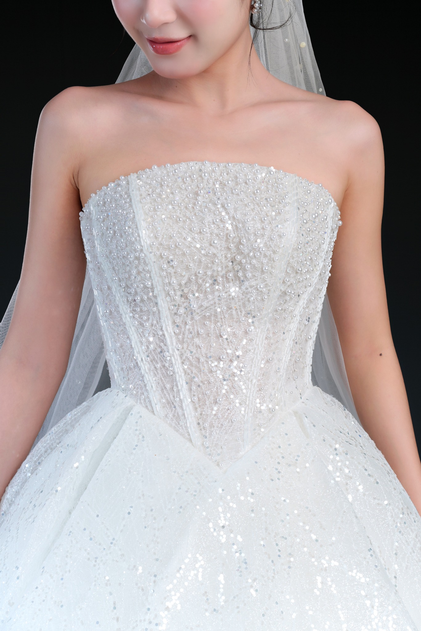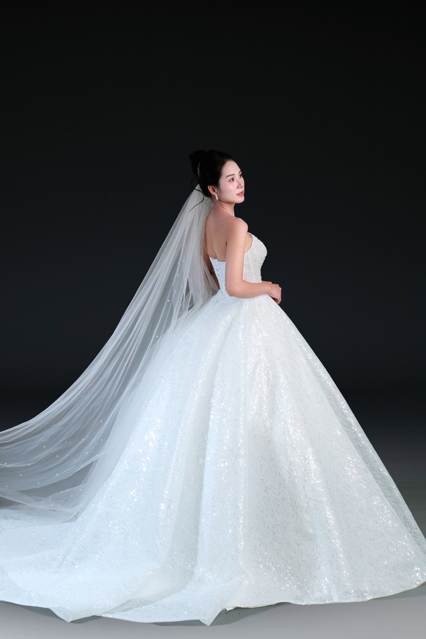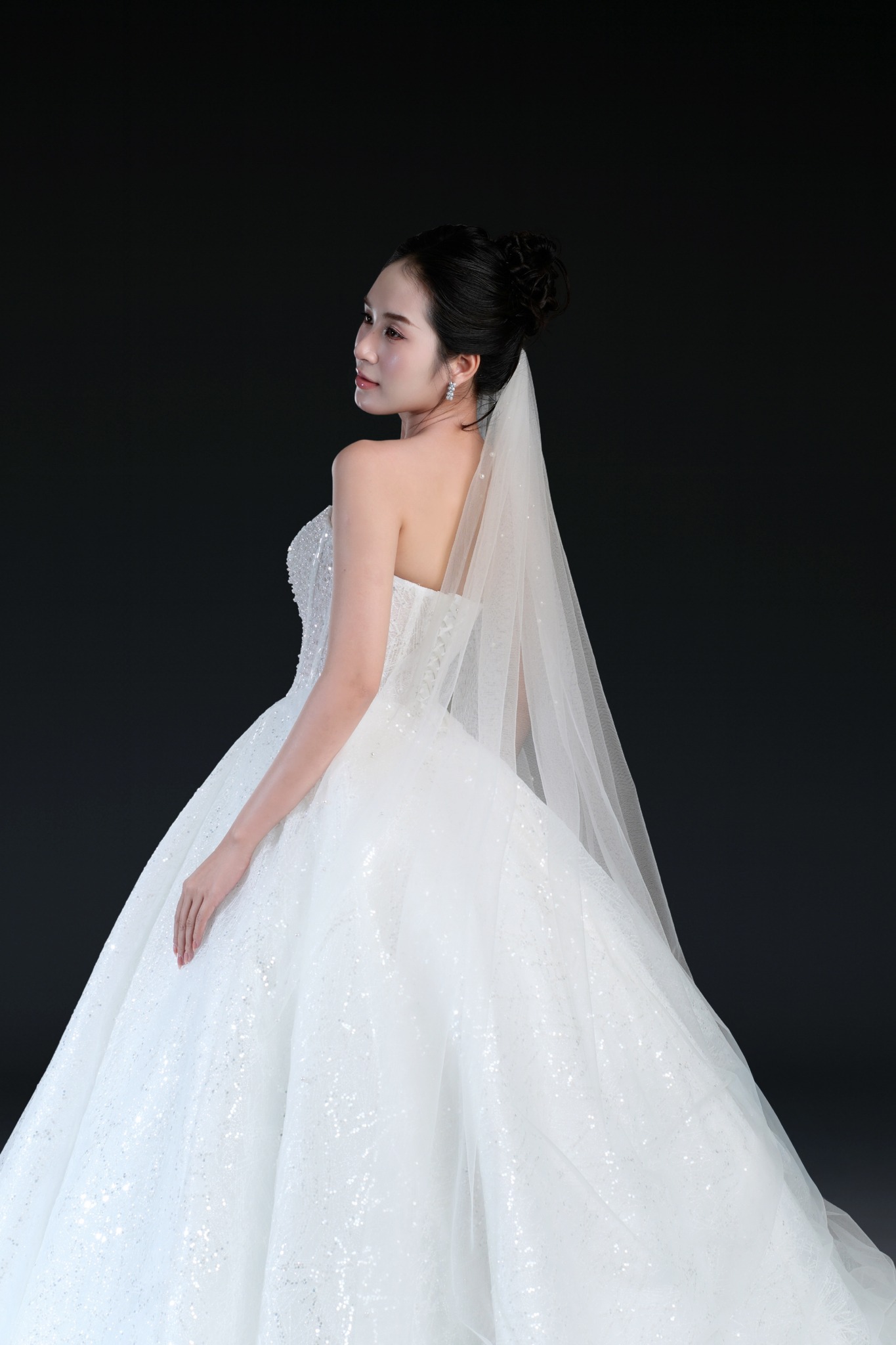 Bộ sưu tập gồm 24 thiết kế, từ form Ball Gown lộng lẫy với kỹ thuật dựng corset signature tôn dáng hoàn hảo, đến form A-line thanh thoát, xòe nhẹ. Mỗi thiết kế đều được xử lý trên nền ren cao cấp, nền vải nhũ dát sequins lấp lánh, cườm đá đính kết thủ công tạo nên hiệu ứng ánh sáng đầy mê hoặc.