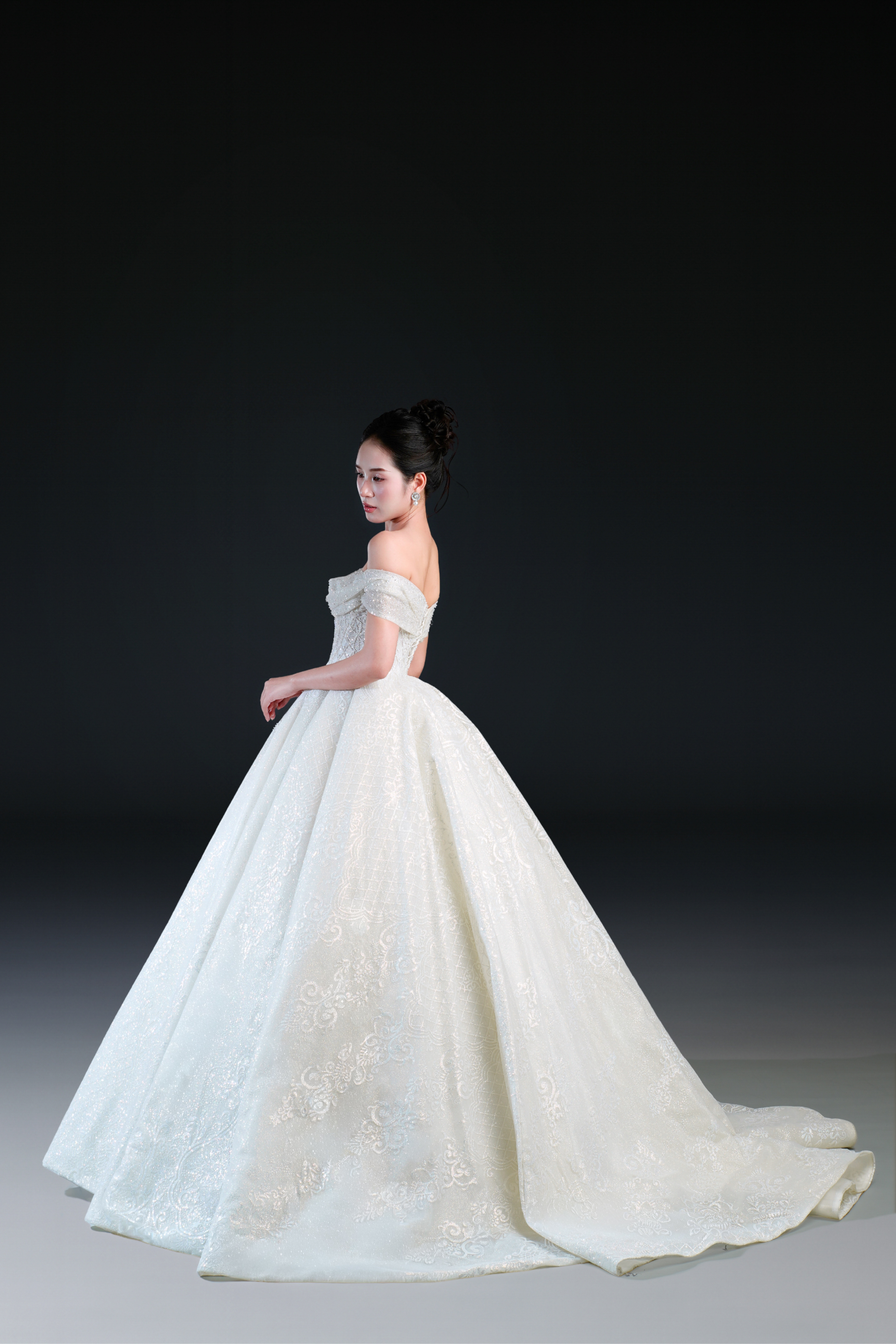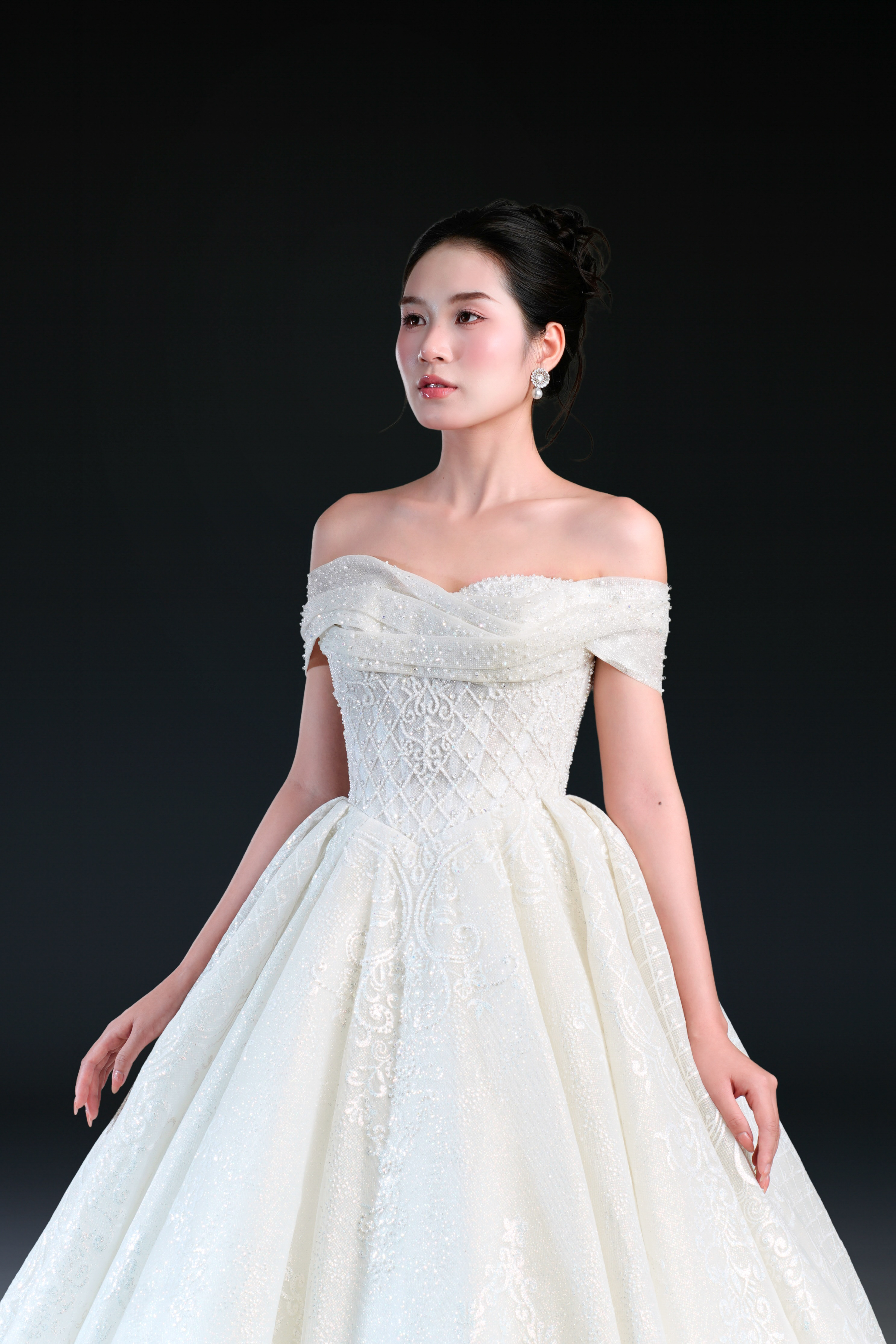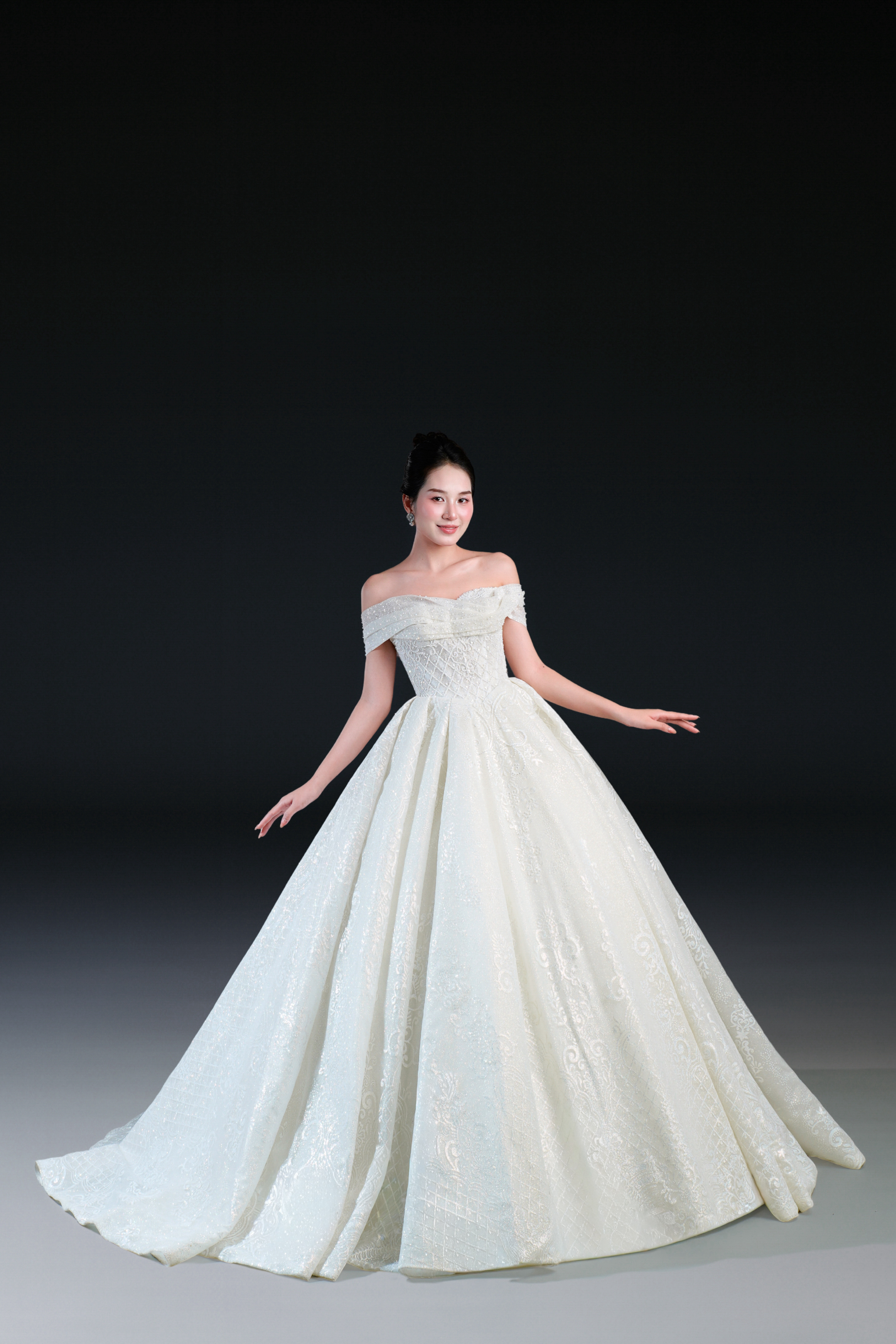 Bộ sưu tập gồm 24 thiết kế, từ form Ball Gown lộng lẫy với kỹ thuật dựng corset signature tôn dáng hoàn hảo, đến form A-line thanh thoát, xòe nhẹ. Mỗi thiết kế đều được xử lý trên nền ren cao cấp, nền vải nhũ dát sequins lấp lánh, cườm đá đính kết thủ công tạo nên hiệu ứng ánh sáng đầy mê hoặc.