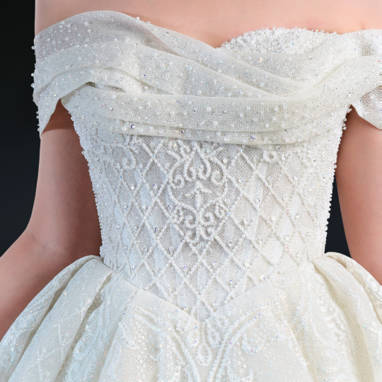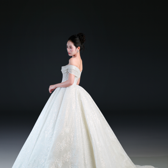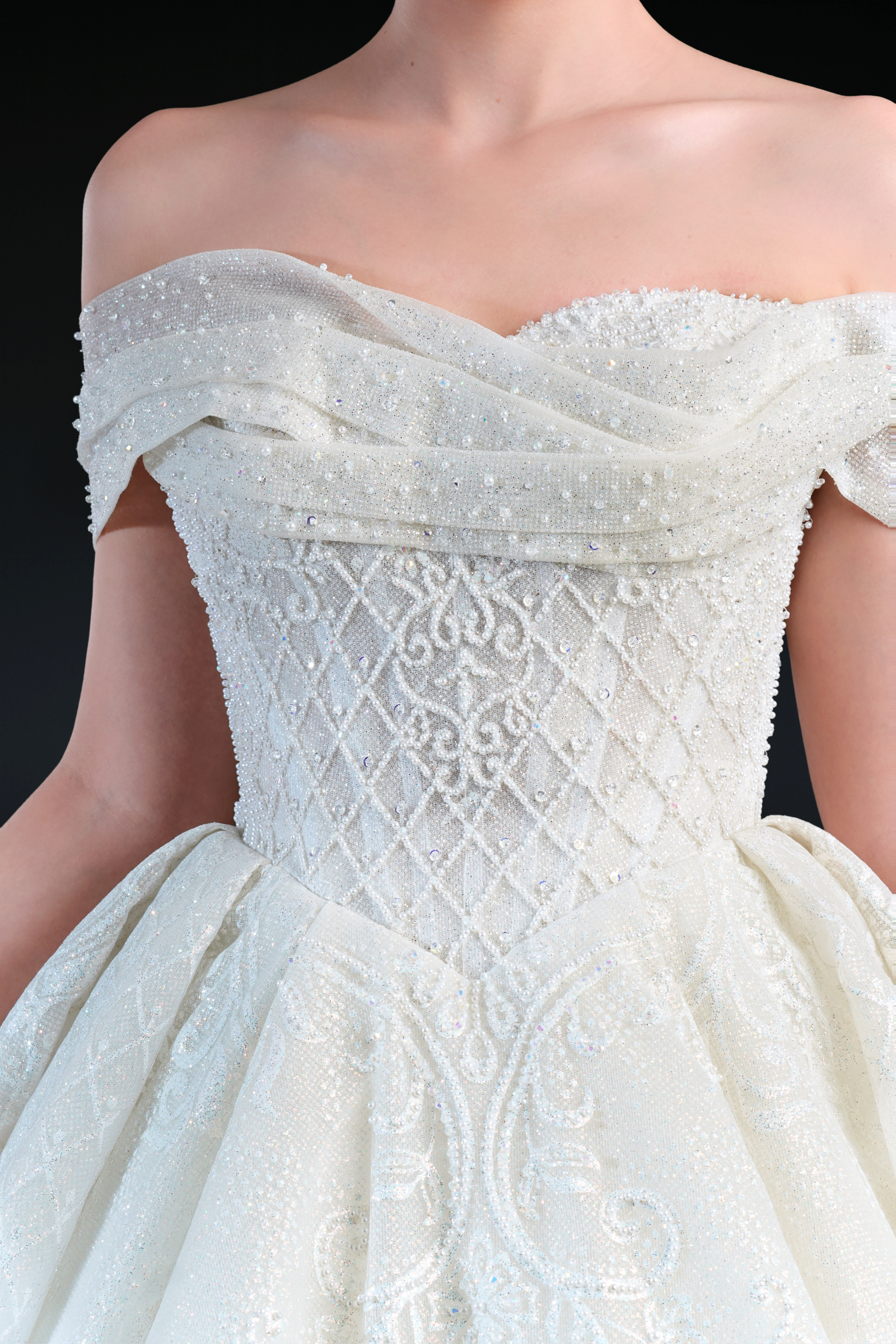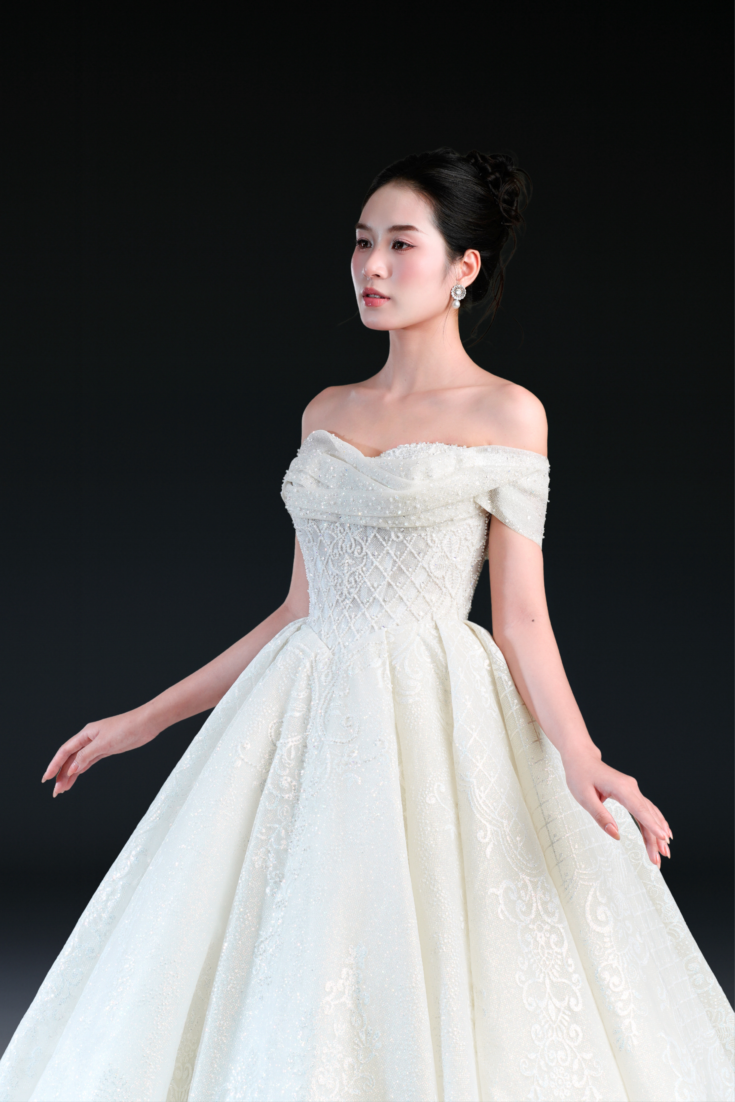 Bộ sưu tập gồm 24 thiết kế, từ form Ball Gown lộng lẫy với kỹ thuật dựng corset signature tôn dáng hoàn hảo, đến form A-line thanh thoát, xòe nhẹ. Mỗi thiết kế đều được xử lý trên nền ren cao cấp, nền vải nhũ dát sequins lấp lánh, cườm đá đính kết thủ công tạo nên hiệu ứng ánh sáng đầy mê hoặc.