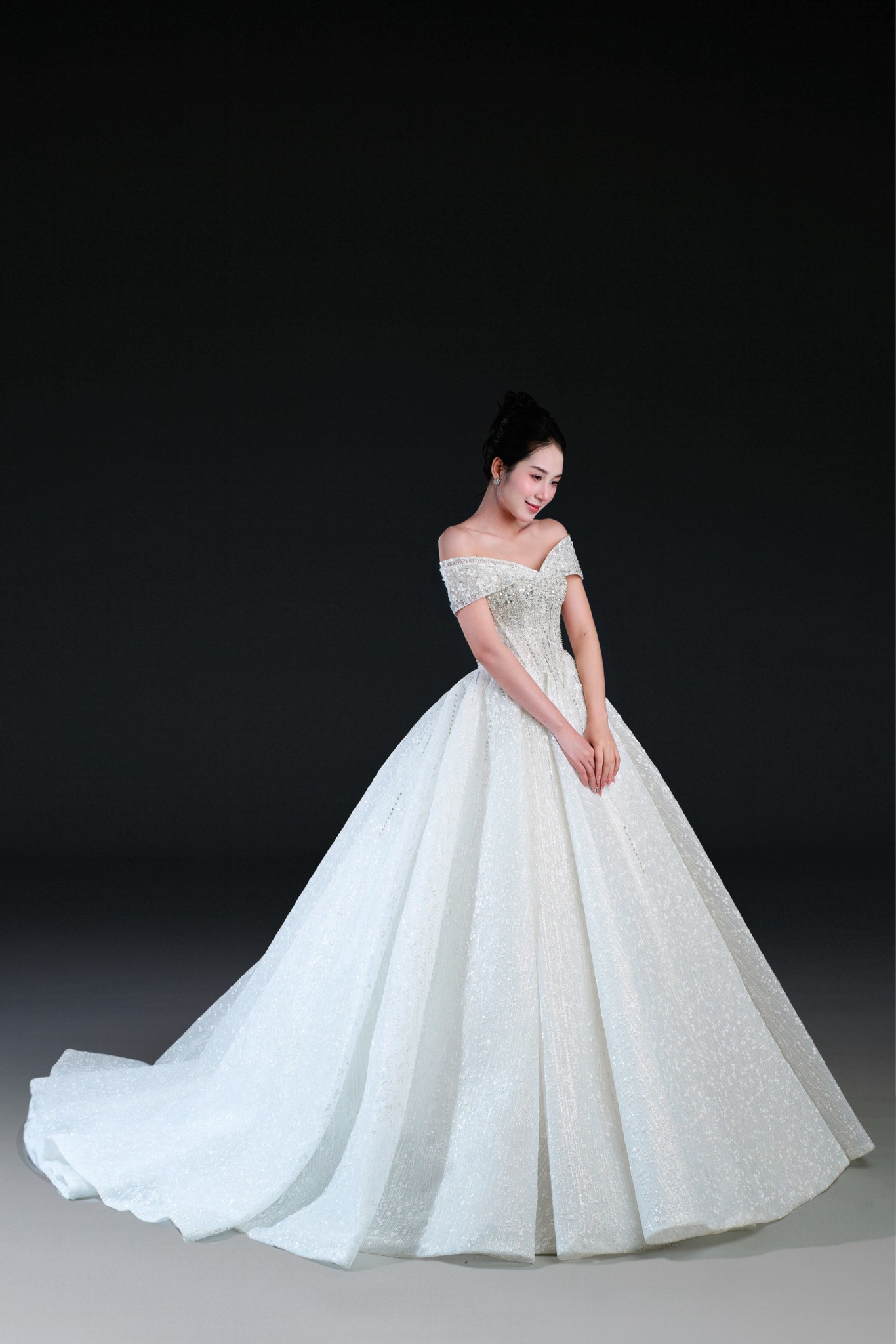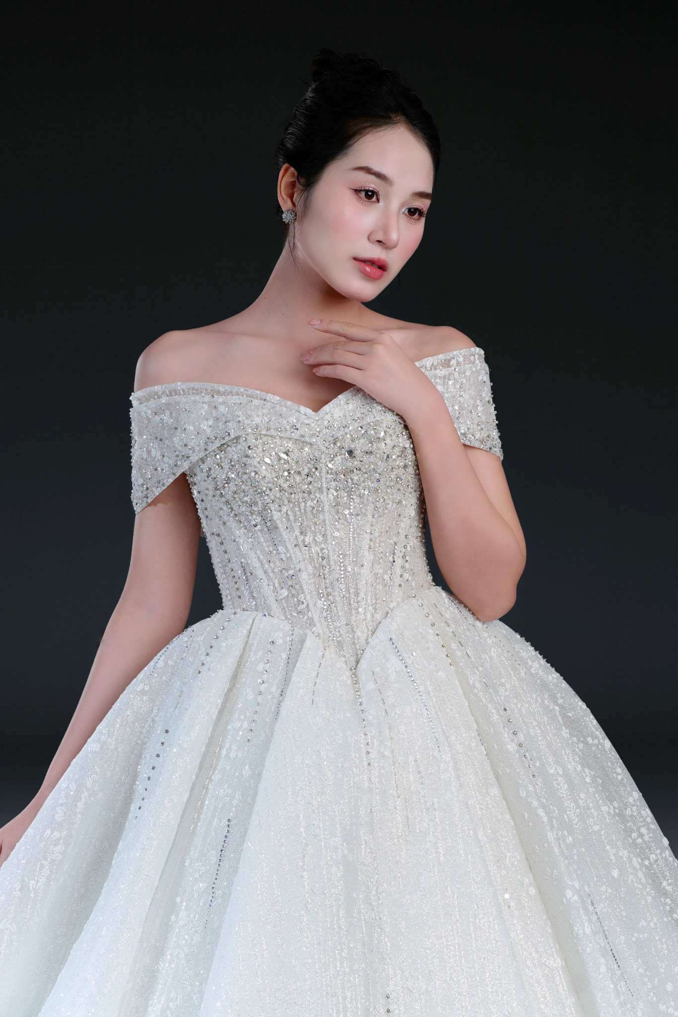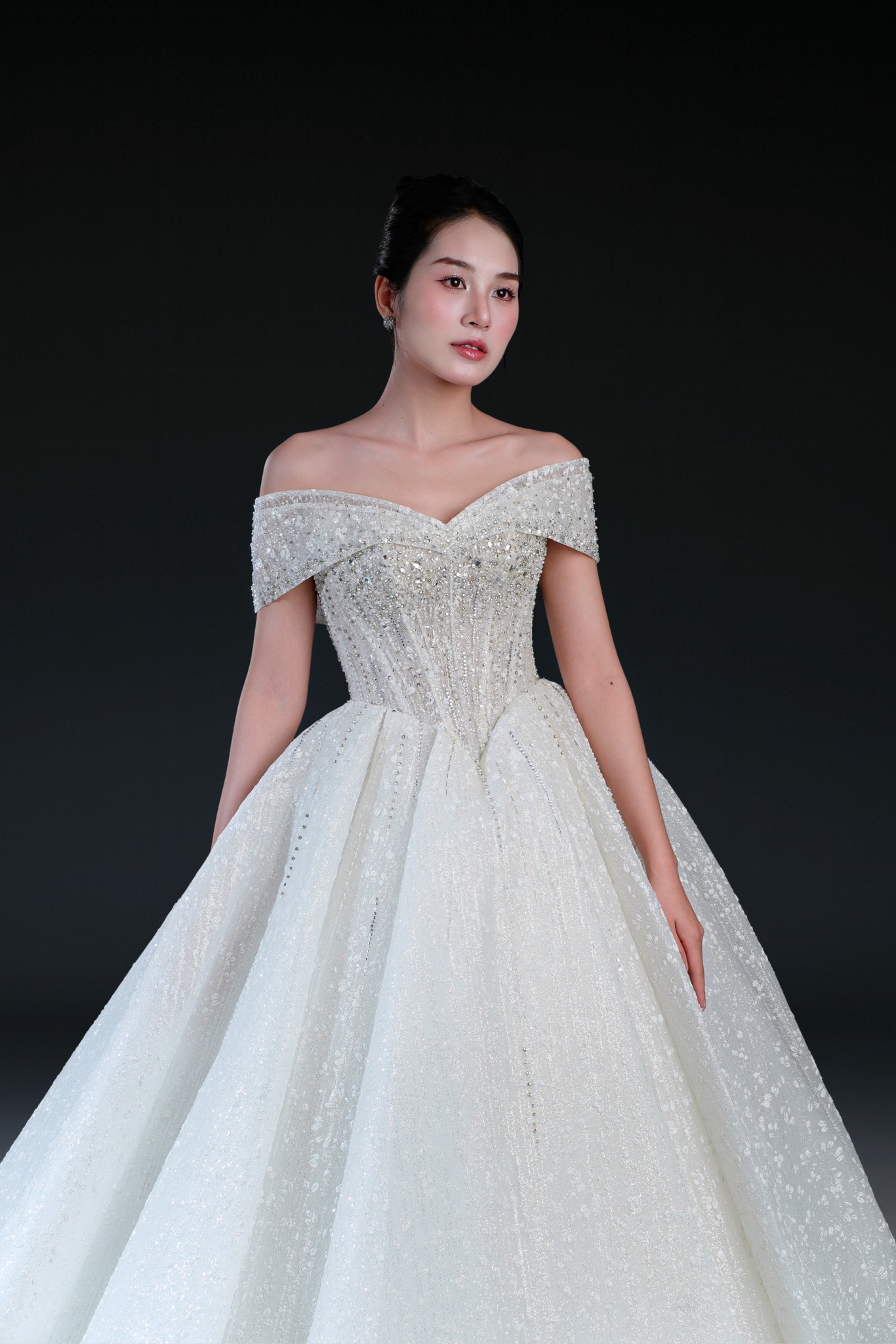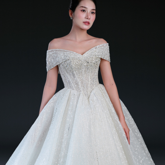 Bộ sưu tập gồm 24 thiết kế, từ form Ball Gown lộng lẫy với kỹ thuật dựng corset signature tôn dáng hoàn hảo, đến form A-line thanh thoát, xòe nhẹ. Mỗi thiết kế đều được xử lý trên nền ren cao cấp, nền vải nhũ dát sequins lấp lánh, cườm đá đính kết thủ công tạo nên hiệu ứng ánh sáng đầy mê hoặc.
