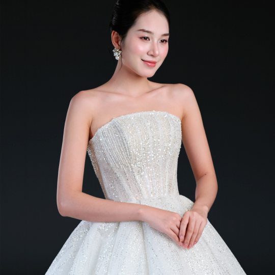Bộ sưu tập gồm 24 thiết kế, từ form Ball Gown lộng lẫy với kỹ thuật dựng corset signature tôn dáng hoàn hảo, đến form A-line thanh thoát, xòe nhẹ. Mỗi thiết kế đều được xử lý trên nền ren cao cấp, nền vải nhũ dát sequins lấp lánh, cườm đá đính kết thủ công tạo nên hiệu ứng ánh sáng đầy mê hoặc.
