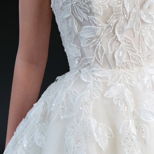 Bộ sưu tập gồm 24 thiết kế, từ form Ball Gown lộng lẫy với kỹ thuật dựng corset signature tôn dáng hoàn hảo, đến form A-line thanh thoát, xòe nhẹ. Mỗi thiết kế đều được xử lý trên nền ren cao cấp, nền vải nhũ dát sequins lấp lánh, cườm đá đính kết thủ công tạo nên hiệu ứng ánh sáng đầy mê hoặc.